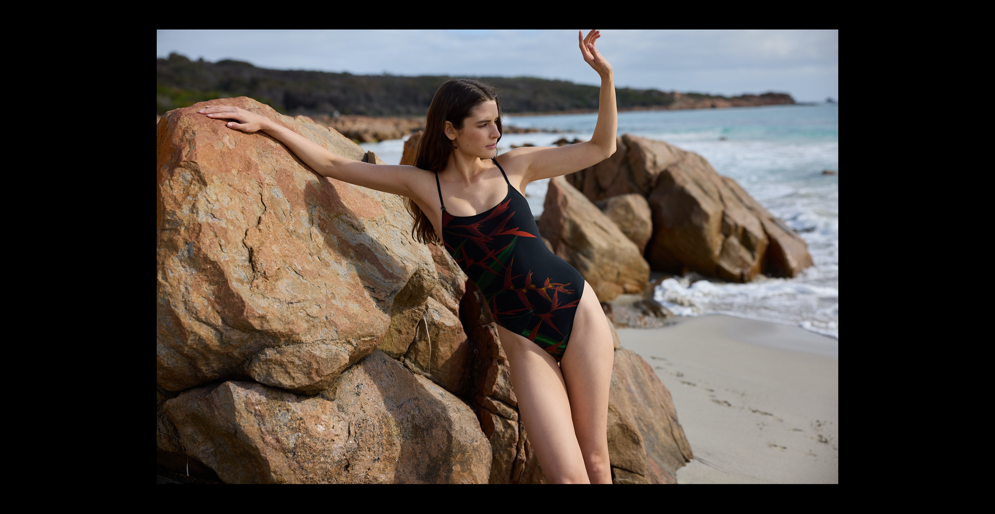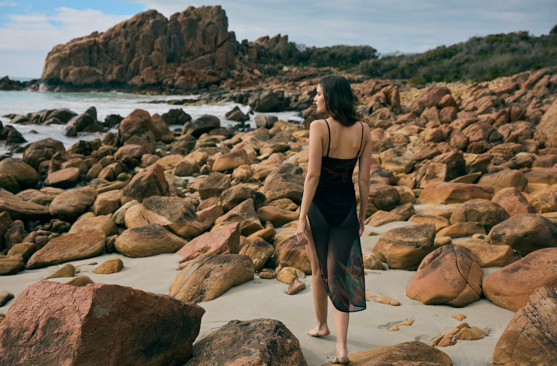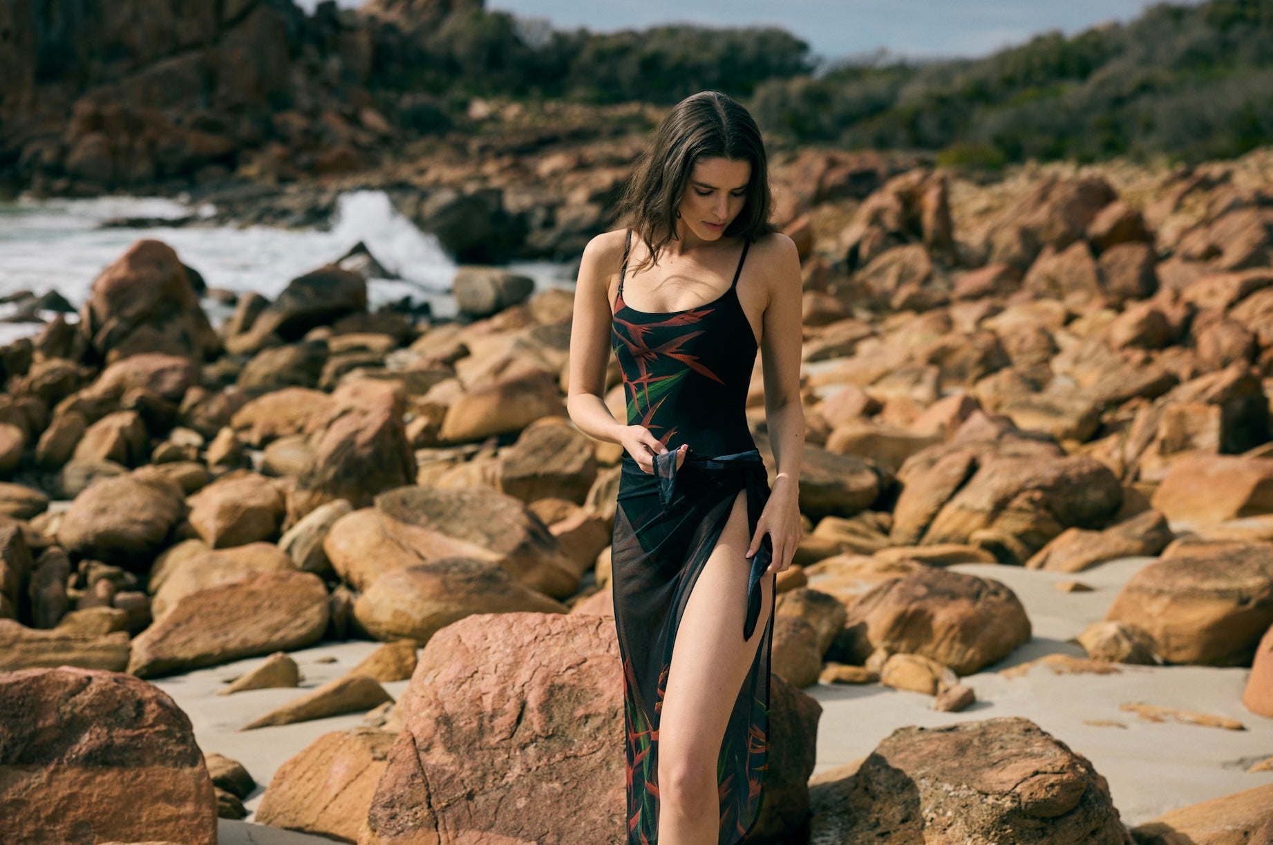 Libby shot by Justin Griffiths, wearing the MESH SQUARE MAILLOT and LONG SARONG, STRELITZIA